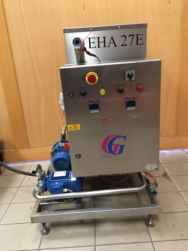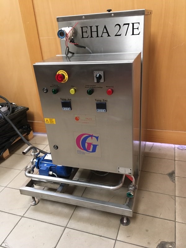 | Equipements | Pasteurisateur avec échangeur coaxial, régulation des températures eau chaude et jus, pompe à jus. Energie électrique 400 V - 27 kW - 50 Ampère - Matériel révisé en usine. |